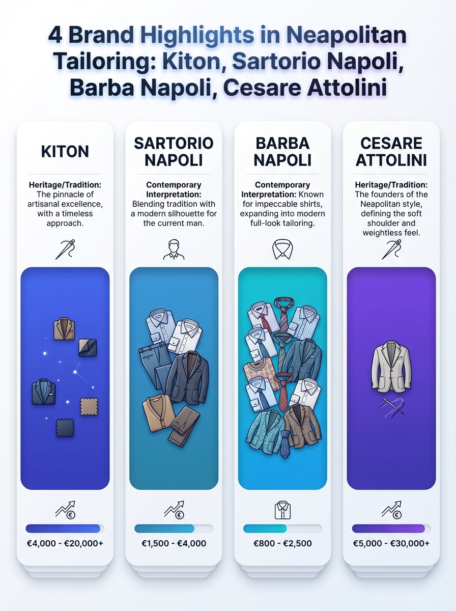 | Which brands best express this vision? | Our core pillars are the Kiton collection, Sartorio Napoli, Barba Napoli, Cesare Attolini, and Isaia, each selected for authentic Neapolitan heritage and handcraft. |
