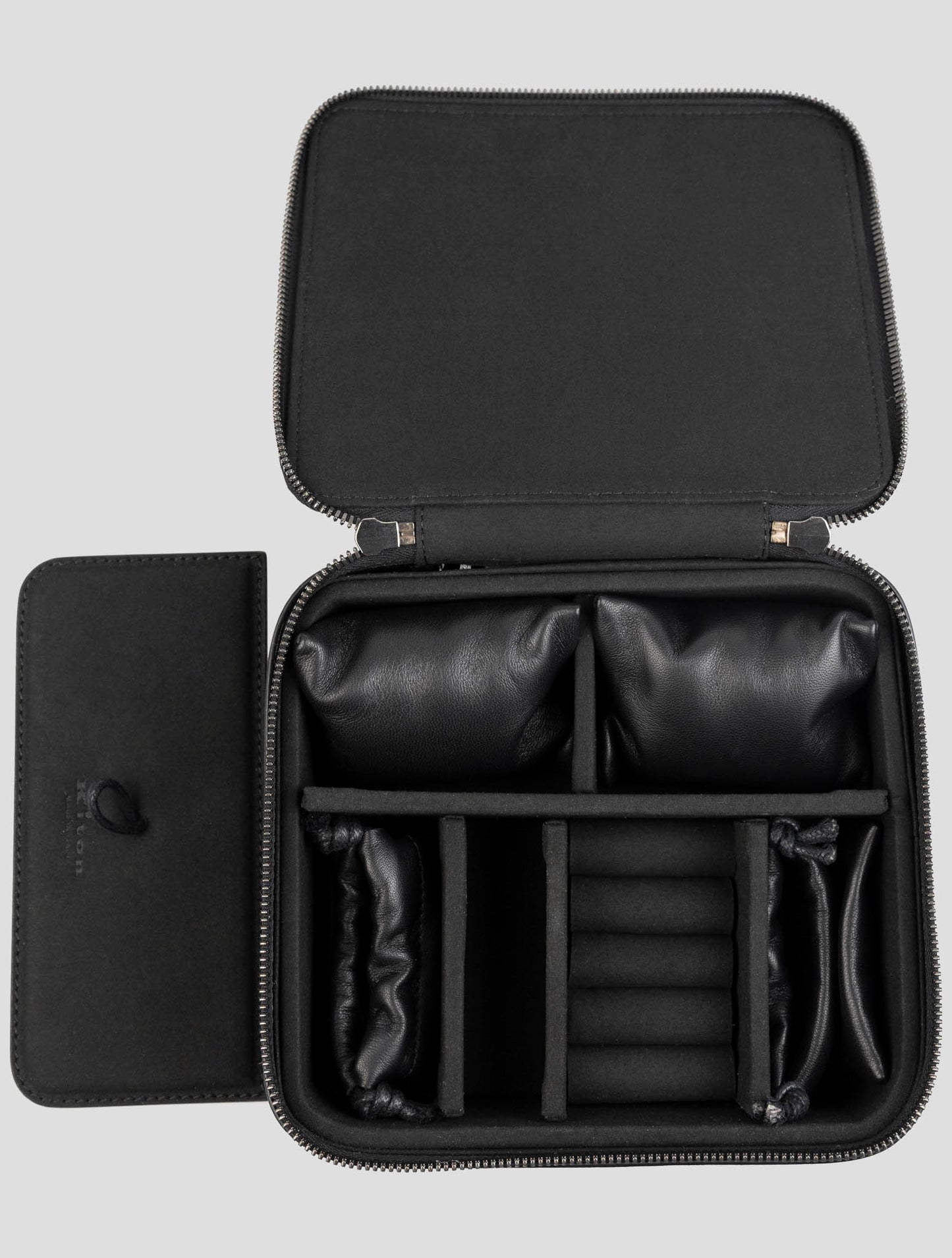 קופסת התכשיטים Kiton Black, עשויה מעור 100% בצבע שחור, מייצגת אומנות איטלקית יוקרתית, המיועדת לאחסון וארגון תכשיטים מתוחכמים. קופסת התכשיטים היוקרתית הזו, המיוצרת בעבודת יד באיטליה מעור שחור אמיתי עם תוספות מעודנות, משלבת פונקציונליות עם עיצוב נצחי.