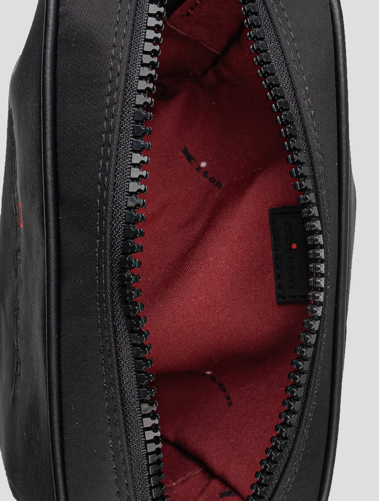 The Kiton men's beauty case is a refined accessory, made from 100% PA (polyamide) with luxurious leather inserts. Designed for the modern man, this sleek black pochette offers both style and functionality. The embroidered Kiton logo adds a touch of sophistication, reflecting the brand's attention to detail and craftsmanship. Ideal for travel or everyday use, it features a spacious interior to store grooming essentials and personal items. Lightweight and durable, the combination of premium materials and elegant design makes this beauty case a must-have accessory for those who appreciate quality and timeless style. | Mod:UBA0026N008080
