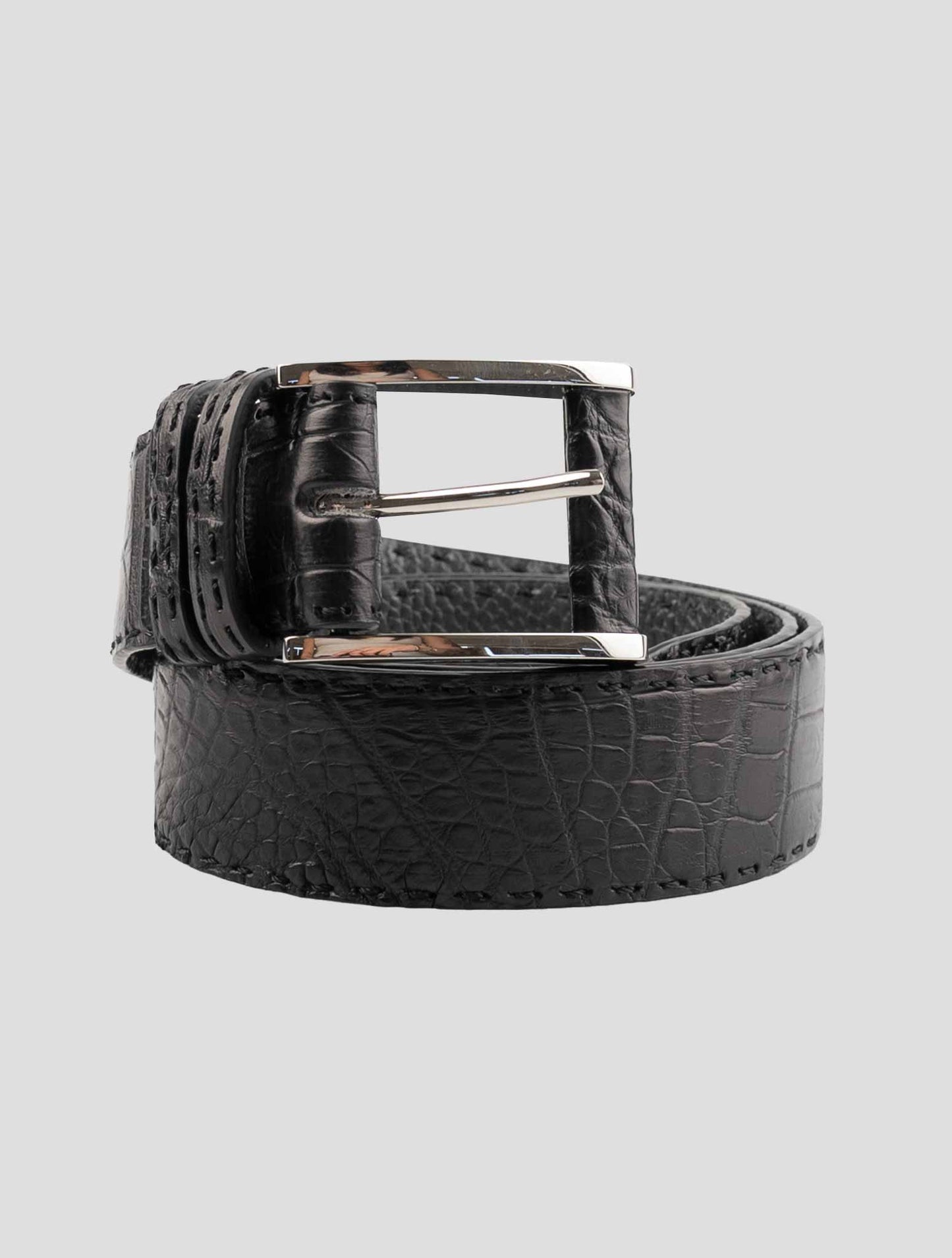 The exotic crocodile leather texture delivers exclusivity and impeccable style. Designed for both formal and casual outfits, this black crocodile belt features precise stitching and a sleek buckle that ensures comfort and durability.