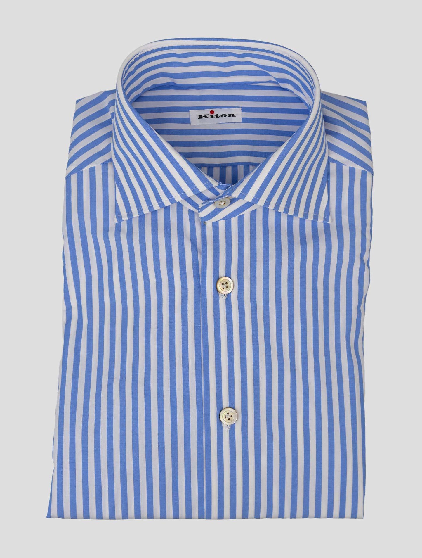 The Kiton Light Blue and White Striped Shirt, crafted from 100% premium cotton, is a perfect blend of elegance and comfort. Featuring a subtle striped pattern in soft light blue and white, this shirt is a versatile choice for both formal and casual occasions. The lightweight cotton fabric ensures breathability and a soft touch, making it ideal for all-day wear. Tailored with precision, it offers a slim fit that enhances the silhouette while maintaining freedom of movement. Whether paired with a tailored suit for a refined look or chinos for a more relaxed style, this shirt embodies Kiton's signature craftsmanship and sophistication. | Mod: UCCH084795
